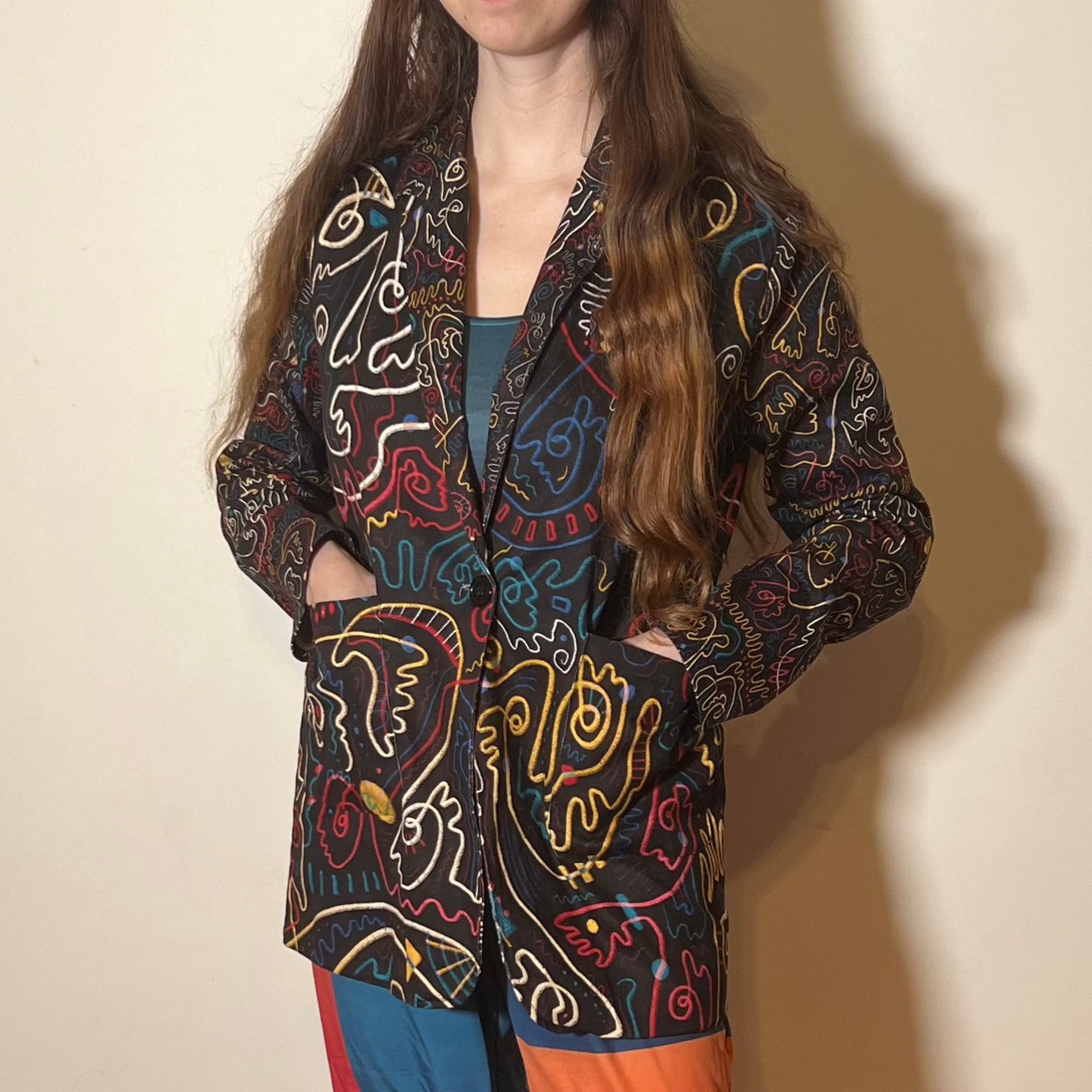 In the example picture, Kira is wearing a size medium pants and a size small blazer.
